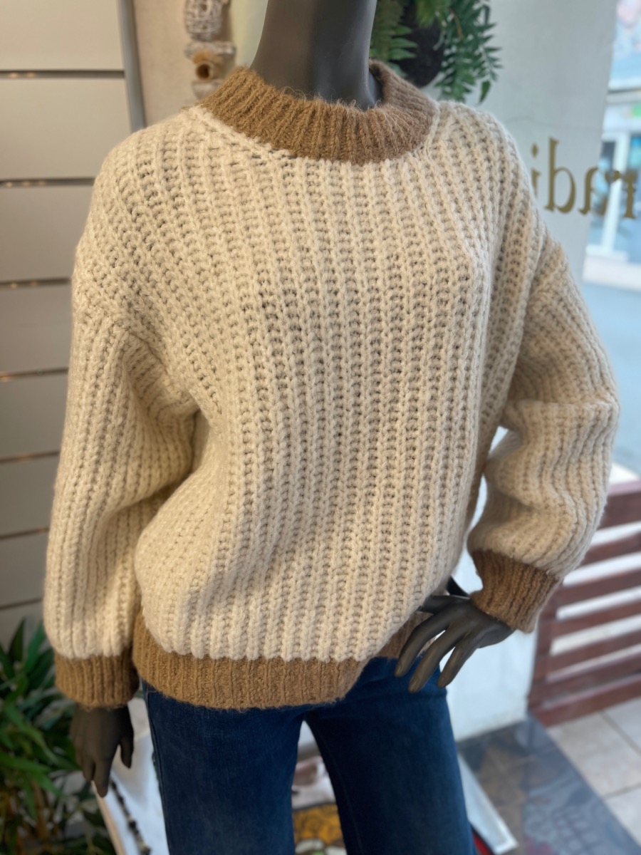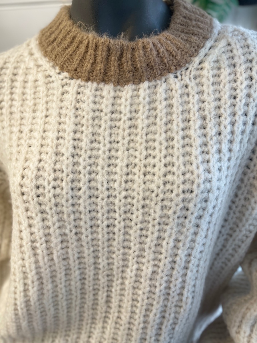 Son col rond contrasté camel, assorti aux poignets et au bas du pull, apporte une touche chic et moderne qui met en valeur la silhouette.