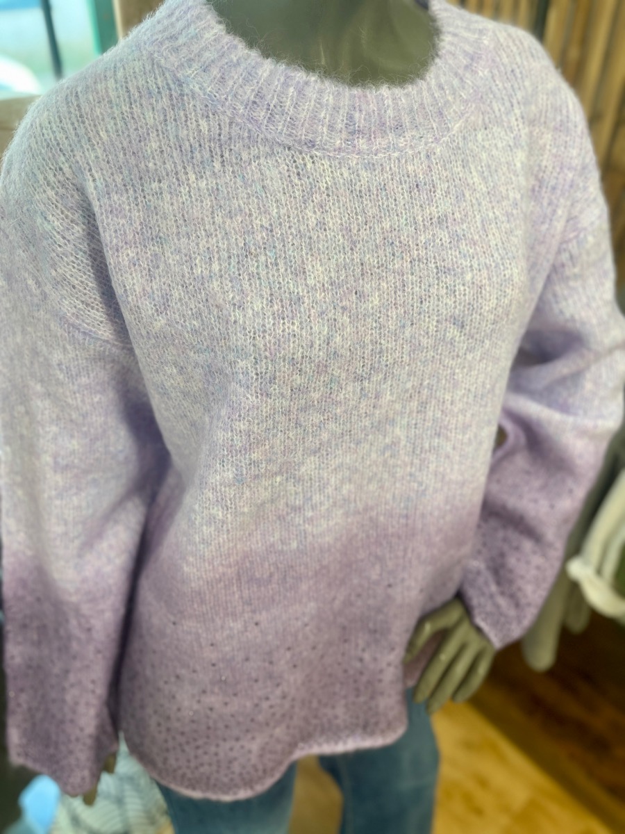 Le haut du pull présente un parme clair lumineux, qui se fond progressivement vers un violet plus soutenu sur le bas.