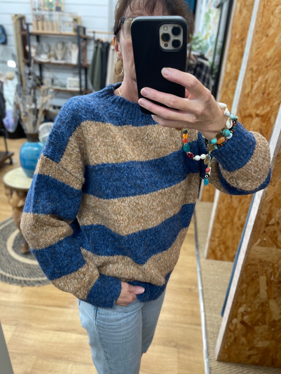 On adore son motif à larges rayures camel et bleu prondond, qui apporte une touche de modernité à ce basique revisité.
