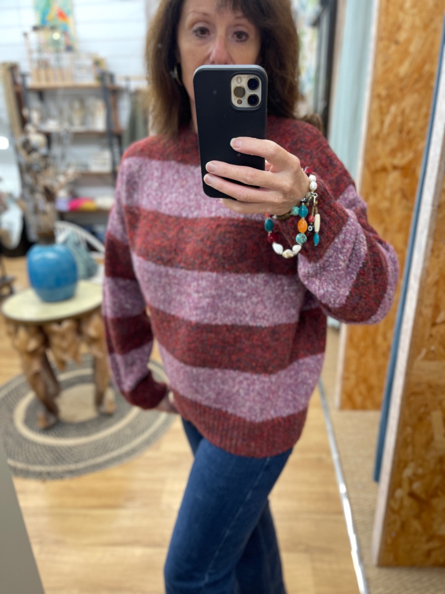 Adoptez un look doux et coloré avec le pull Tod bordeaux et rose signé Johanna Paris.