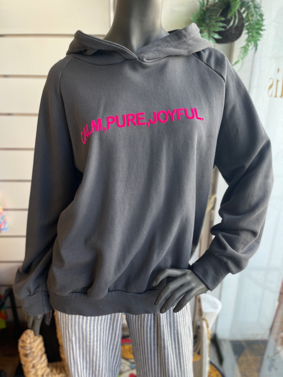 Son coloris gris anthracite est sublimé par une inscription rose fuchsia sur le devant avec le message "Calm, Pure, Joyful", qui apporte une touche moderne et lumineuse.